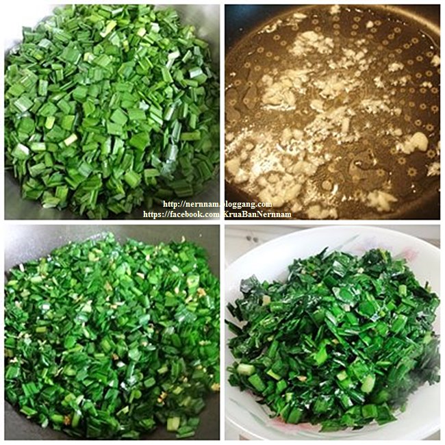 1.ทำไส้กุยช่ายก่อนเป็นอันดับแรก โดยการหมักกุยช่ายกับเกลือให้เข้ากัน จากนั้นพักไว้ 15 นาทีเป็นอย่างน้อย จากนั้นให้เราทำการตั้งกระทะโดยใช้ไฟกลาง จากนั้นให้ใส่กระเทียมลงผัดพอเหลืองหอม จากนั้นตักมาพักไว้ให้หายร้อน