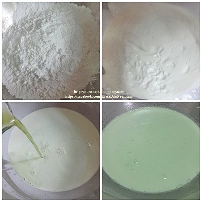 4. น้ำใบเตย 1 ถ้วย (ถ้าต้องการสีอื่นใช้น้ำอัญชัญทดแทนได้เช่นเดียวกันค่ะ)