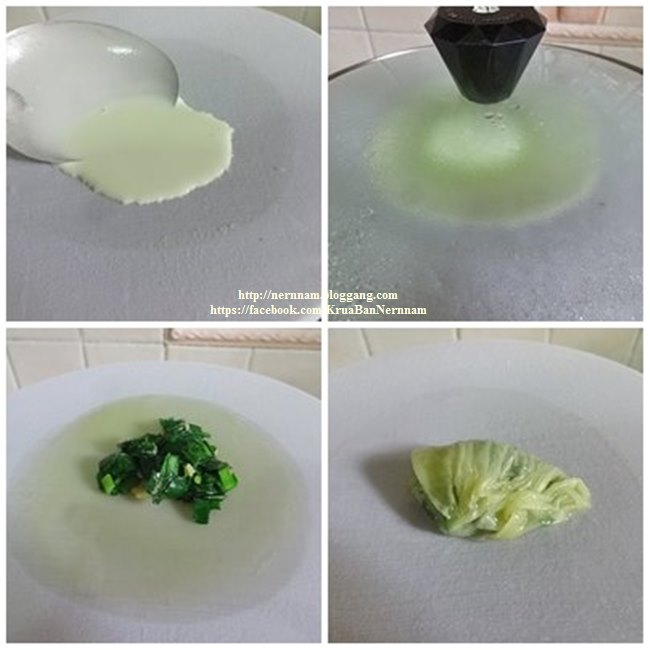 5.จากนั้นใช้ทัพพีของเราตักแป้งละเลงเป็นแผ่นบางๆ จากนั้นให้ปิดฝาครอบไว้ 5 วินาที แล้วทำการตักไส้กุยช่ายใส่ลงไป จากนั้นใช้พายปาดให้แป้งย่นหุ้มไส้ จากนั้นให้ตักใส่ในจานที่มีน้ำมันอยู่เล็กน้อย กันติดกันจนเกินไป