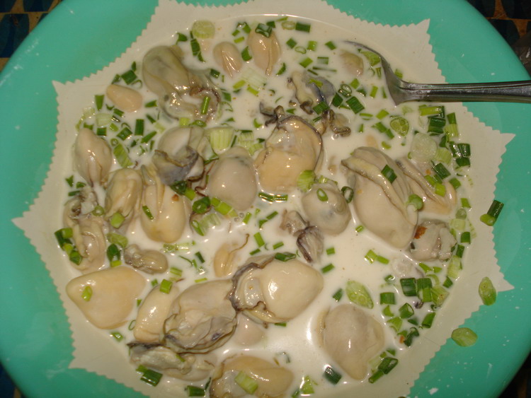 1.ให้เราทำการล้างหอยนางรมให้สะอาด จากนั้นนำไปแช่น้ำปูนใส 15 นาที ก่อนนำไปล้างน้ำแล้วใส่กระชอนพักไว้ให้สะเด็ดน้ำ