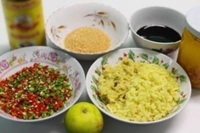 3.ระหว่างที่รอข้าวหุงสุก ให้เตรียมน้ำจิ้มโดยผสมซีอิ๊วขาว ซีอิ๊วดำ น้ำตาล กระเทียม เต้าเจี้ยว มะนาว ขิง และพริกขี้หนูเข้าด้วยกัน ปรุงรสตามใจชอบ
